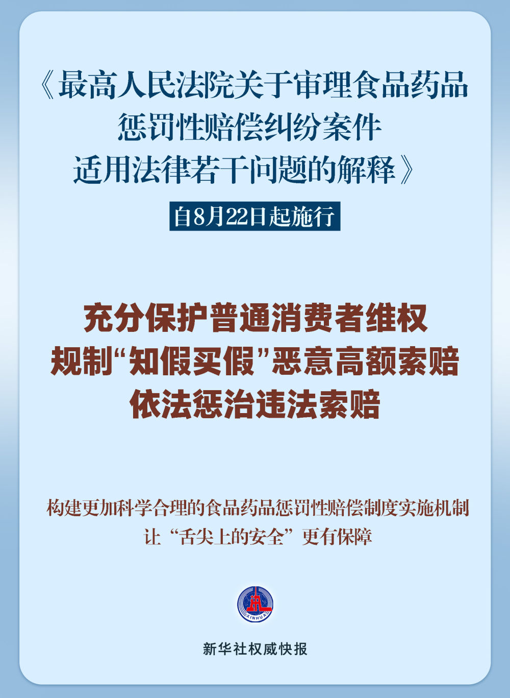 《最高人民法院关于审理食品药品惩罚性赔偿纠纷案件适用法律若干问题的解释》8月21日发布,自22日起施行。