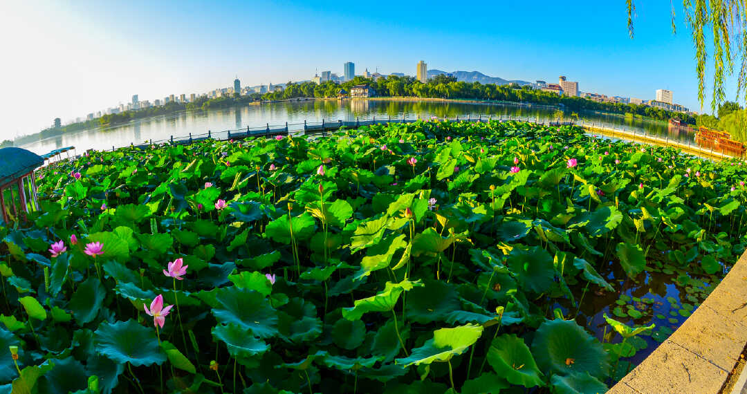 济南种植莲荷已有上千年的历史。早在魏晋时期,便开始大范围种植荷花。唐代荷田已成规模,因荷花众多而被称为“莲子湖”。直到金代,诗人元好问(yuán hào wèn)在《济南行记》中始称“大明湖”,一直沿用至今。