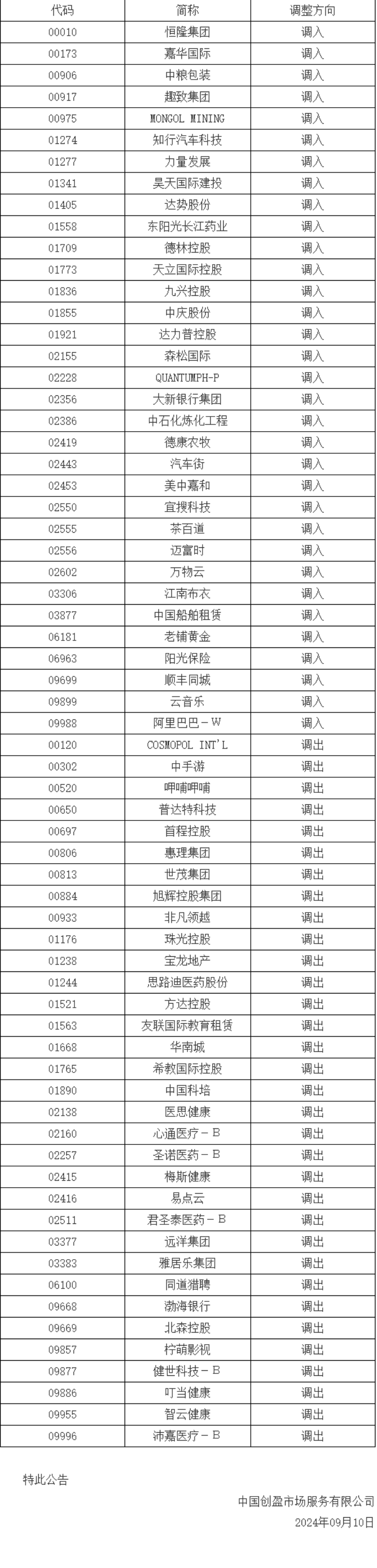 CYQY-生活与科技财联社消息,沪深交易所发布通知,因恒生综合大型股指数、中型股指数、小型股指数实施成份股调整,港股通标的名单发生调整,并自下一港股通交易日起生效。调入阿里巴巴、知行汽车科技、顺丰同城等33只股票,调出宝龙地产、世茂集团、远洋集团等33只股票。