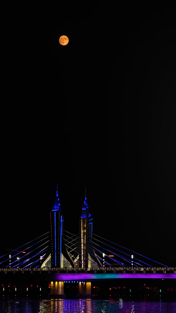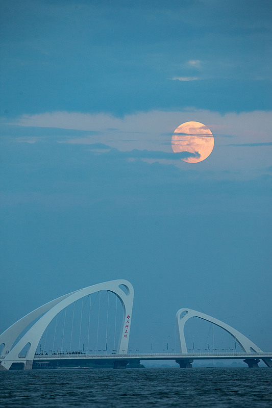 2024年9月17日,江苏淮安,一轮圆月从白马湖上升起,与“鱼跃龙门”造型的白马湖大桥相映成趣。
