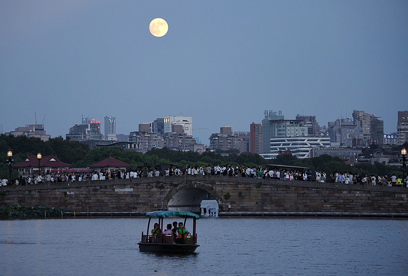 2024年9月17日,游客在杭州西湖断桥上观赏“超级月亮”。