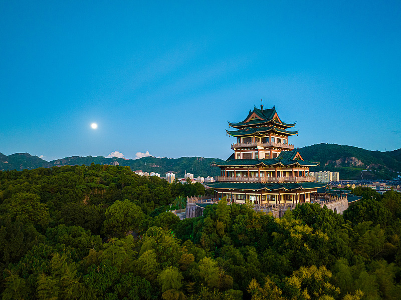 2024年9月17日,浙江台州,温岭市太平街道,航拍月亮与东辉阁同框。