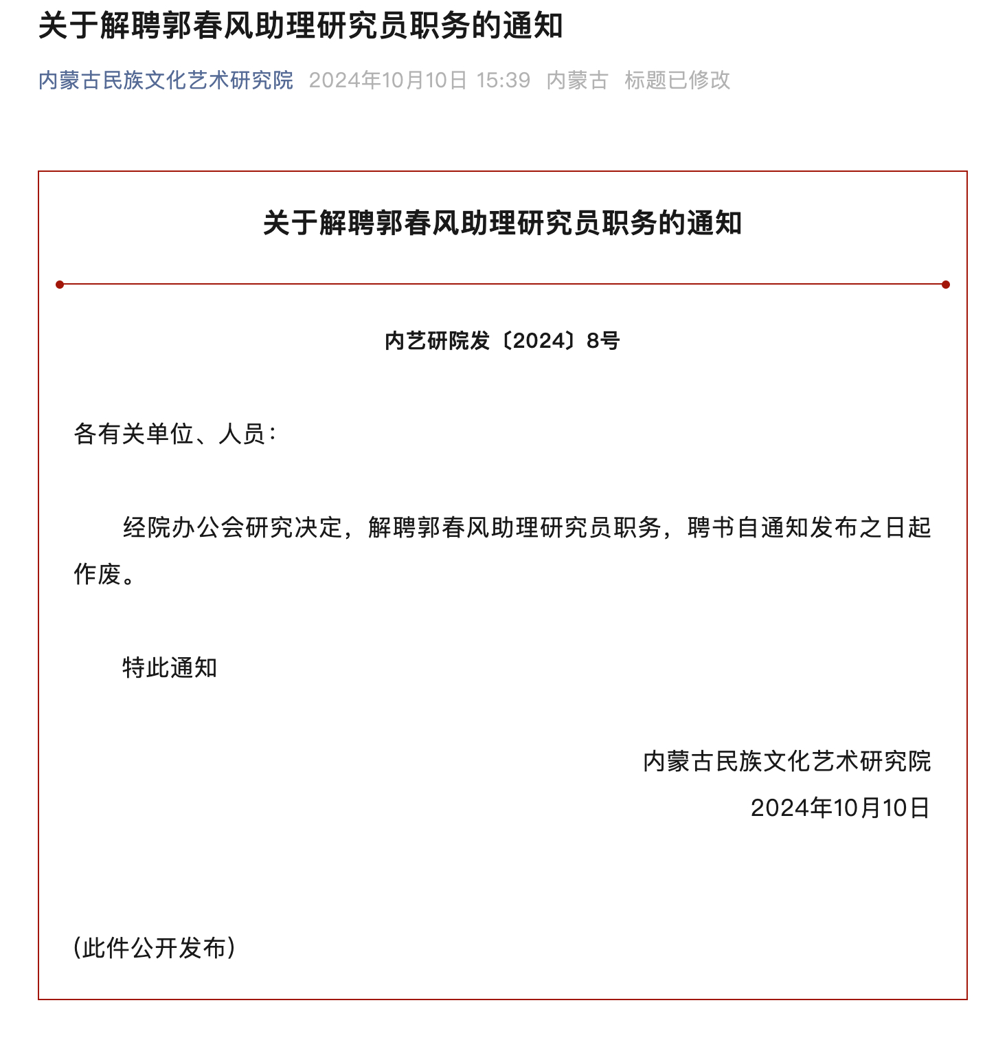在郭春风被解聘当天的稍早些时候,内蒙古民族文化艺术研究院官方微信公众号还曾发布了郭春风的个人信息。10日晚,相关微信文章显示“该内容已被发布者删除”。