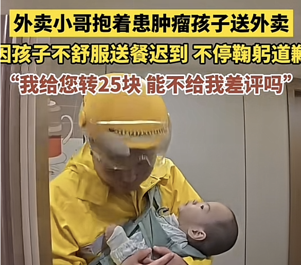 相关视频显示,一个身着美团骑手服饰的男子抱着孩子,向视频拍摄者连连道歉称:“不好意思,刚才孩子有点不舒服,孩子的气管切开了,有点呼吸不上来。”并表示:“我给你转25块钱,能别给我差评吗?”