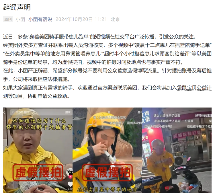 “经美团外卖多方查证并联系出镜人员沟通核实,多个视频中‘凌晨十二点患儿在摇篮陪骑手送单’‘在外卖员集中等单的地方用鼻饲管喂养患儿’‘超时半个小时抱着患儿求顾客别给差评’等以美团骑手身份送单的场景,均为虚假摆拍,视频中的拍摄时间及地点也与事实严重不符。”