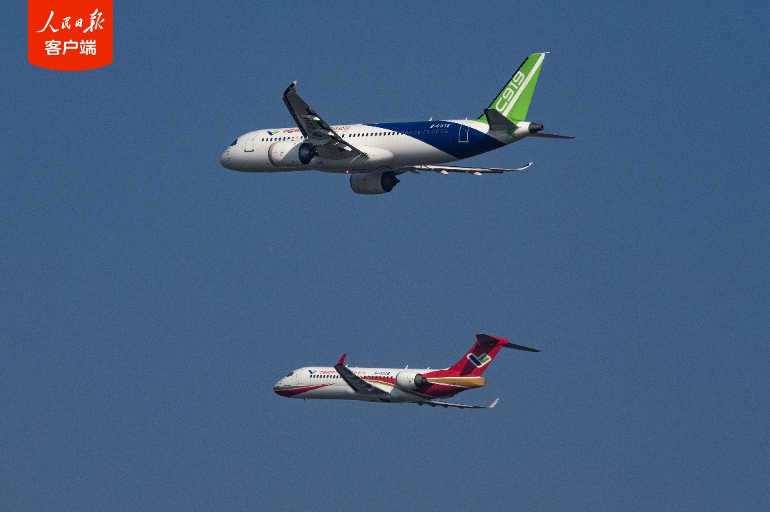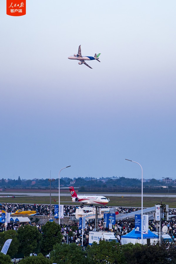 随后,ARJ21飞机先行着陆,C919飞机继续进行低空通场、大俯仰角爬升等单机飞行表演。飞行大会期间,这两架飞机还将进行地面静态展示。
