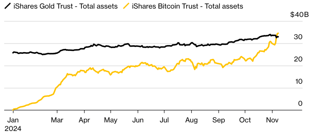 黄色为贝莱德iShares比特币信托基金总资产 黑色为iShares黄金信托基金。来源:bloomberg