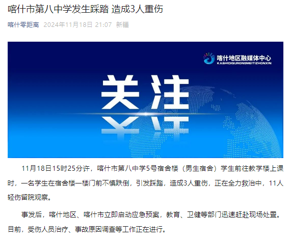 CYQY-生活与科技据喀什融媒体中心官微消息,11月18日15时25分许,喀什市第八中学5号宿舍楼(男生宿舍)学生前往教学楼上课时,一名学生在宿舍楼一楼门前不慎跌倒,引发踩踏,造成3人重伤,正在全力救治中,11人轻伤留院观察。