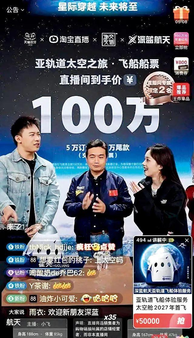 不久前,340多万人在线围观了2张“太空飞船”船票的直播售卖过程。这场由商业航天公司发起的太空旅行,将于2027年兑现。为短暂逃离地球,每位购票人最终需支付100万元。