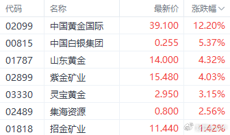 得益于国际金价结束6连跌,港股黄金股多数上涨。截至发稿, 中国黄金国际(02099.HK)、中国白银集团(00815.HK)、山东黄金(01787.HK)、紫金矿业(02899.HK)分别上涨12.20%、5.37%、4.32%、4.03%。