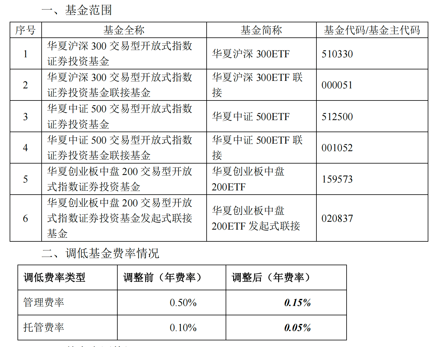 与此同时,华夏基金还公告称,自2024年11月22日起,调低华夏沪深300ETF、华夏中证500ETF等6只基金的管理费率、托管费率,管理费年费率由0.50%调低至0.15%,托管费年费率由0.10%调低至0.05%。