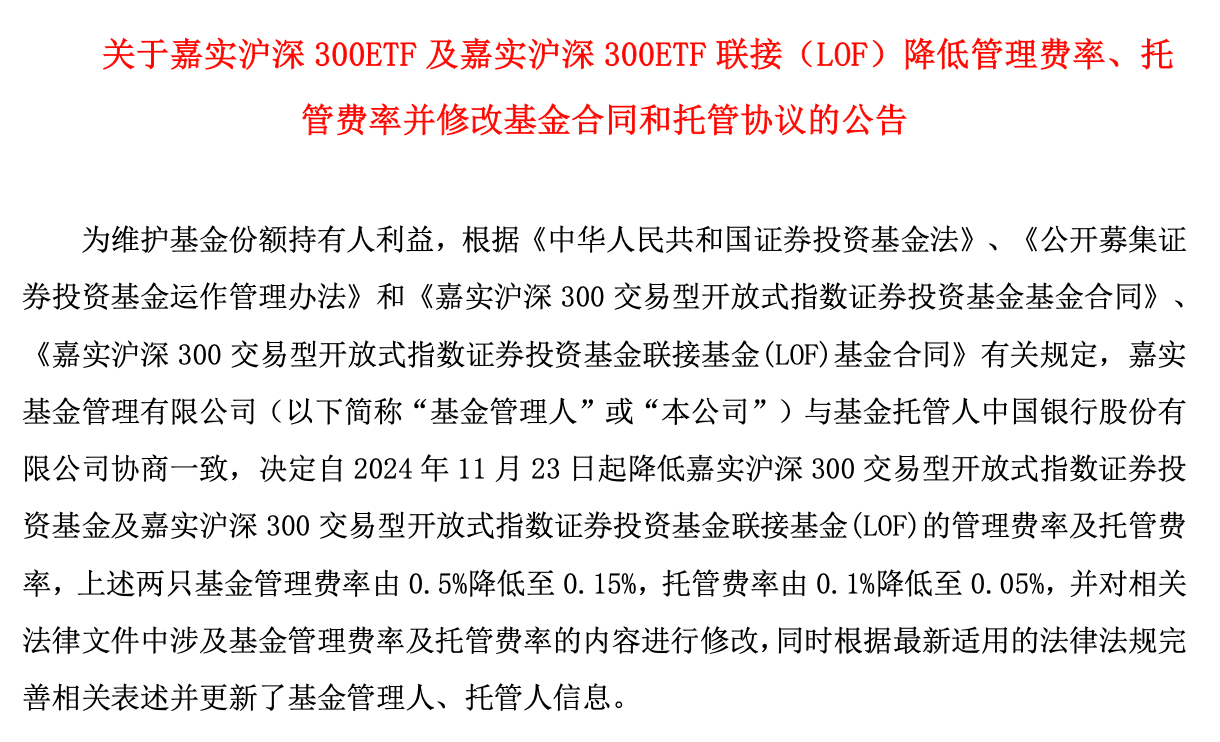 嘉实基金同样公告称,自2024年11月23日起,降低嘉实沪深300ETF及联接基金(LOF)的管理费率及托管费率,两只基金管理费率由0.5%降低至0.15%,托管费率由0.1%降低至0.05%。