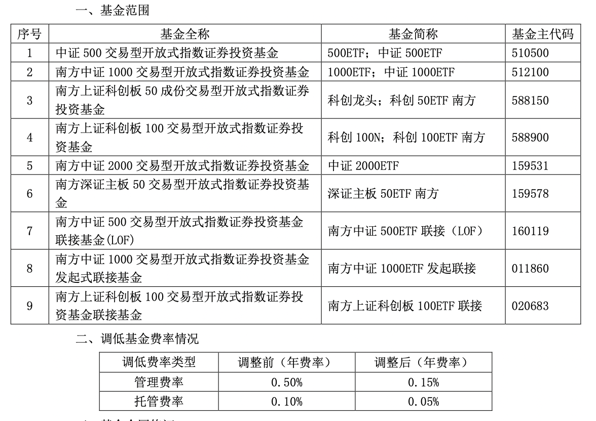 南方基金公告称,决定自2024年11月20日起,调低南方中证500ETF、南方中证1000ETF等9只基金的管理费率和托管费率,其中管理费率从年费率0.50%降至0.15%,托管费率年费率从0.10%降至0.05%。