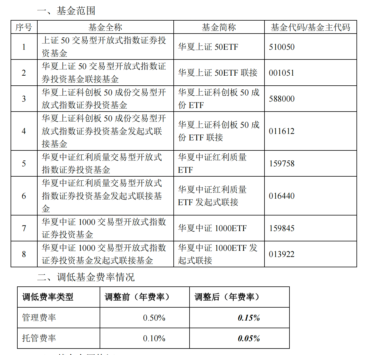 华夏基金公告称,自2024年11月20日起,调低华夏上证50ETF、华夏中证红利质量ETF等8只基金的管理费率、托管费率,管理费年费率也都是由0.50%调低至0.15%,托管费年费率由0.10%调低至0.05%。
