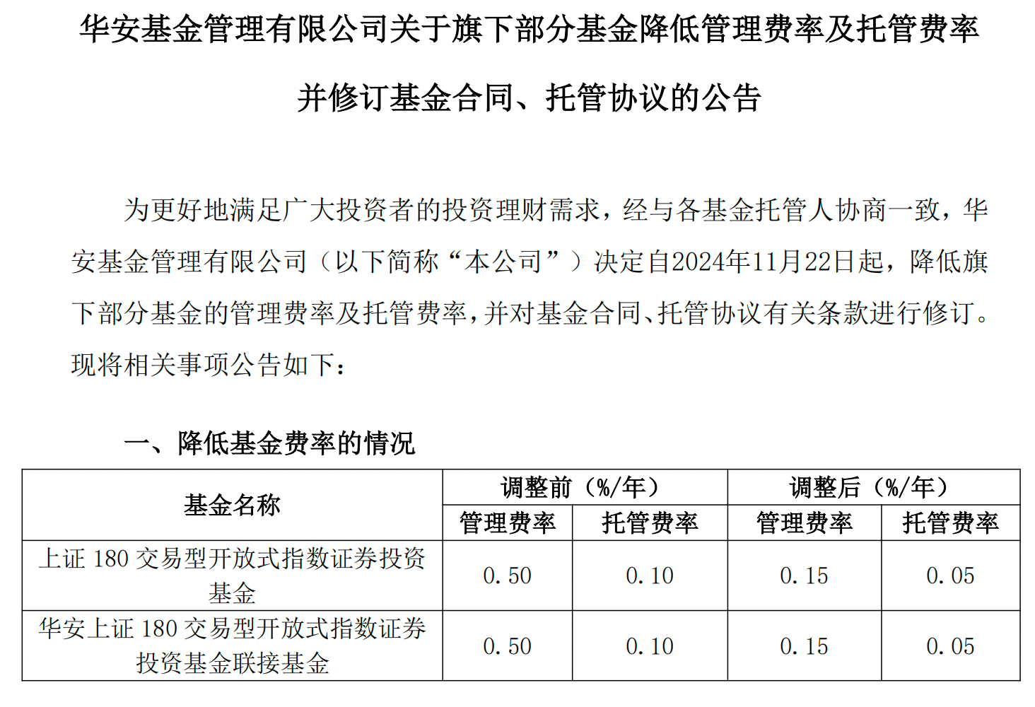 华安基金公告称,自2024年11月22日起,调低华安上证180ETF及联接基金的管理费率及托管费率,两只基金管理费率由0.5%降低至0.15%,托管费率由0.1%降低至0.05%。