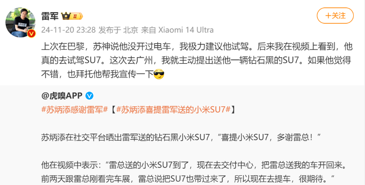 11月20日,苏炳添在社交平台晒出雷军送的钻石黑小米SU7,“喜提小米SU7,多谢雷总!”