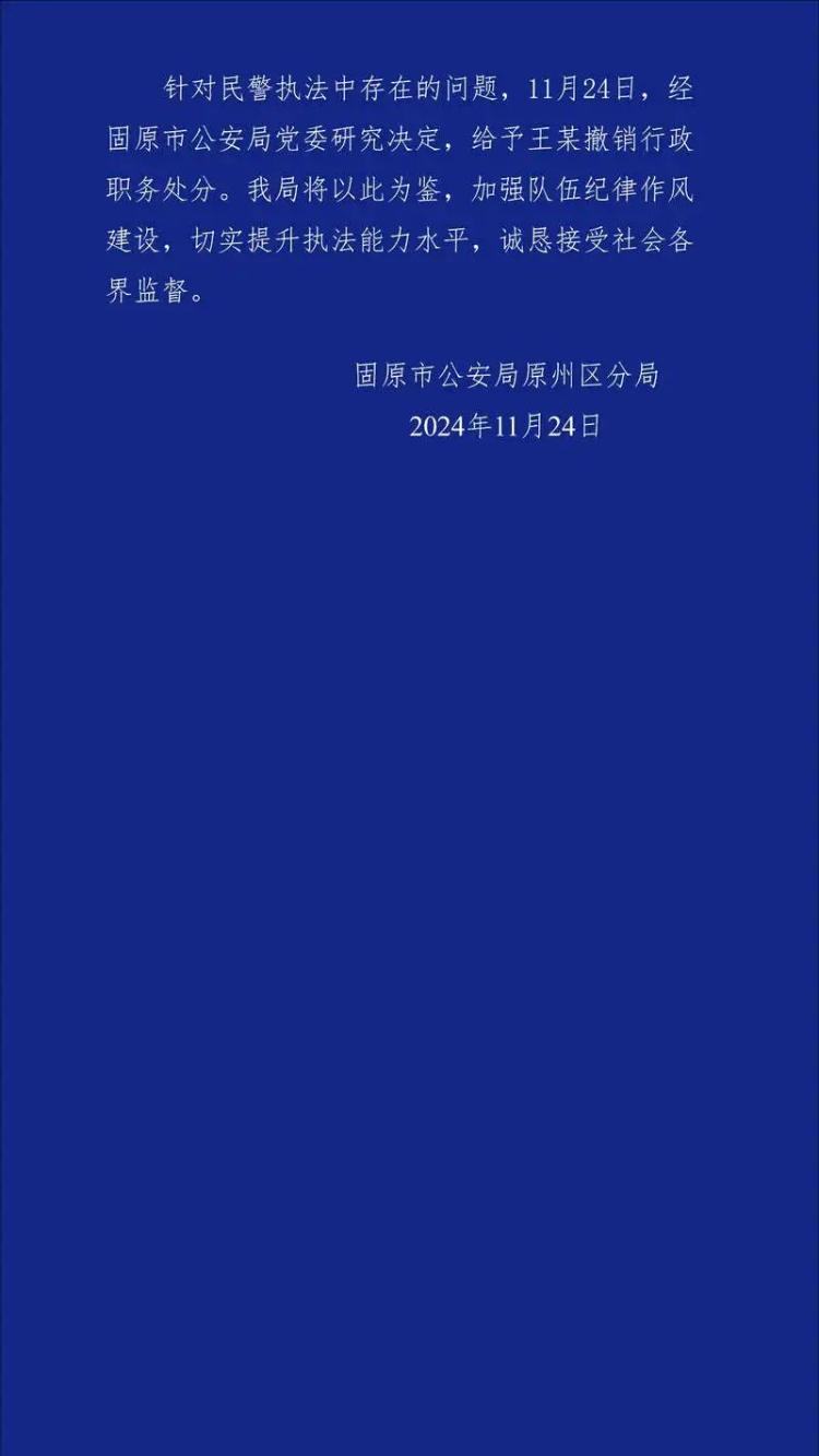 11月23日,固原市公安局党委对王某停职配合调查,并向当事人家属赔礼道歉。11月24日,经固原市公安局党委研究决定,针对民警执法中存在的问题,给予王某撤销行政职务处分。