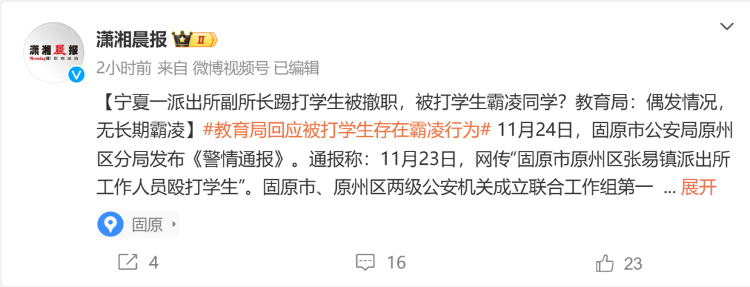 有消息称,该学生存在霸凌同学的行为,上述警情通报中也提到“该校两名三年级学生反映其被同校六年级学生马某某多次殴打”。11月24日,潇湘晨报记者联系到了固原市原州区教育局,工作人员表示,通报中六年级学生殴打低年级学生的情况就是当天发生的,是偶发情况,并不存在长期的校园霸凌。
