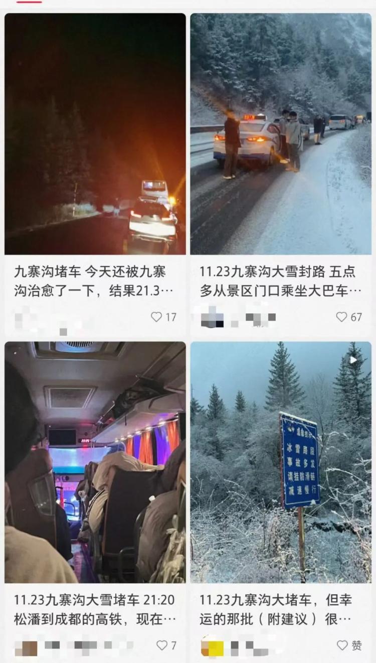 11月23日晚,有多名游客发帖称,由于九寨沟景区通往黄龙九寨高铁站方向的道路大堵车,当天下午游玩结束后原本2小时的路程堵成了4-6小时,大批游客未能赶上当晚末班火车返回成都,不得不滞留松潘,后续酒店、机票等行程均受到影响。11月24日,松潘县文旅部门回应称,交通部门已经调派大巴将滞留游客送往高铁站,“类似大堵车的情况还是第一次见。”
