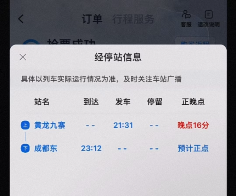24日,记者也询问了黄龙九寨站,工作人员证实,昨晚黄龙九寨开往成都东的C5814原定21点31分发车,“因为旅客堵车的原因等待了十多分钟,最后是21点47分发车的,具体有多少旅客未能赶上这趟车并不清楚。”