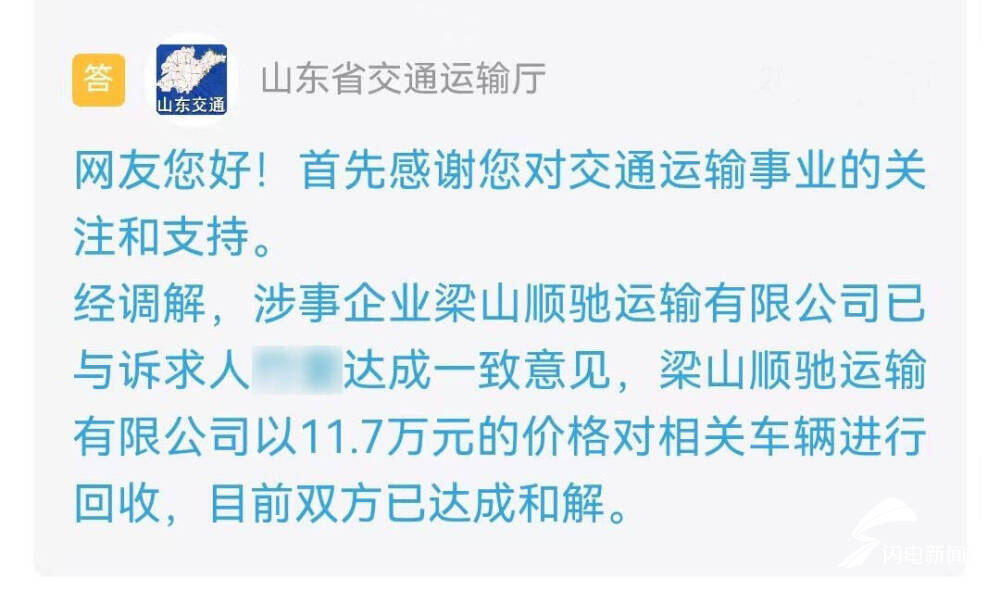 山东省交通运输厅进行了办理并回复:经调解,涉事企业梁山顺驰运输有限公司已与诉求人达成一致意见,梁山顺驰运输有限公司以11.7万元的价格对相关车辆进行回收,目前双方已达成和解。
