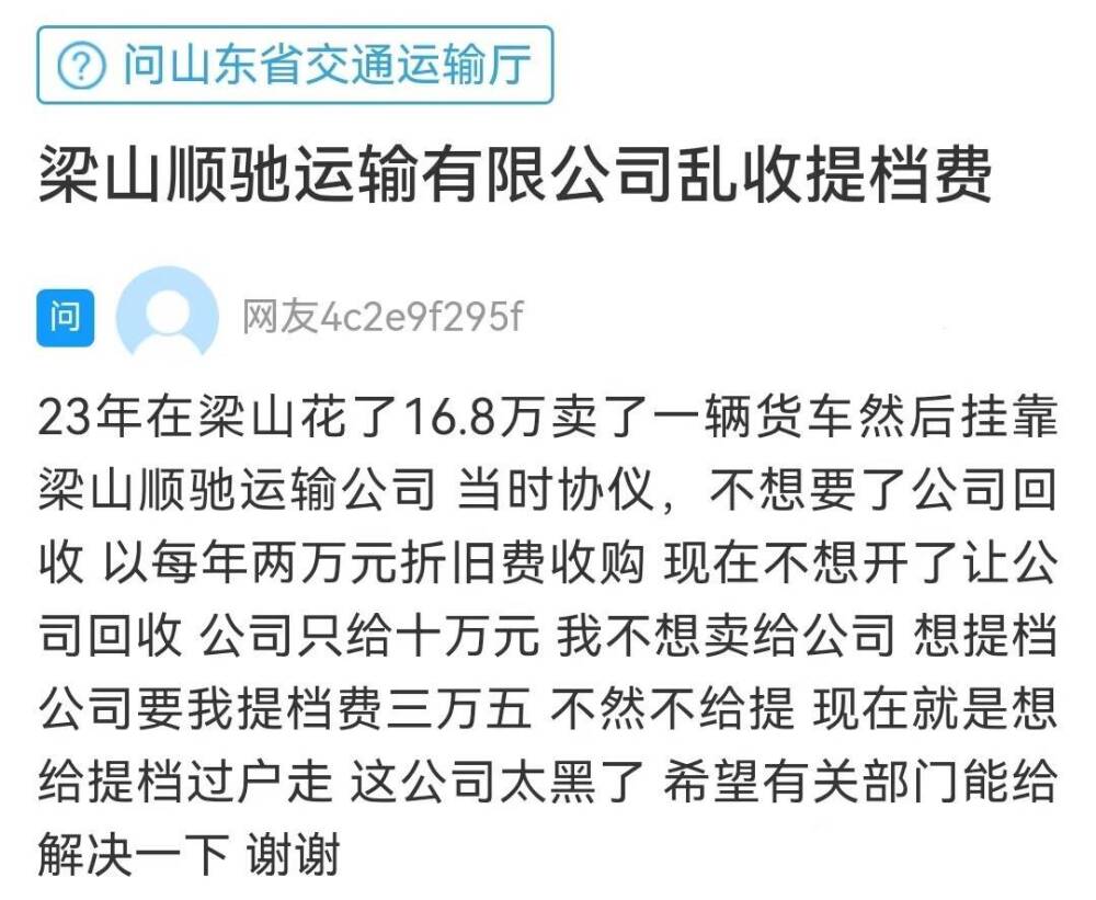 齐鲁网·闪电新闻11月26日讯 一位济宁网友在《问政山东》网络问政平台留言:2023年他花了16.8万买了一辆货车,并挂靠梁山顺驰运输公司。当时签署的协议里写着:如公司回收,以每年2万元折旧费收购。现在他不想开了,让公司回收,公司只给10万元。他想提档,公司要提档费3.5万。希望有关部门能给解决。