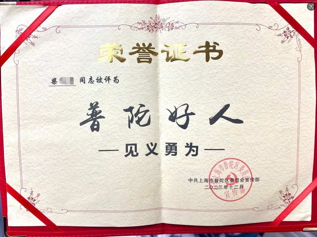 事后,柴先生的见义勇为行为得到广泛关注,上海市普陀区委宣传部计划对柴先生颁发“见义勇为”荣誉证书。