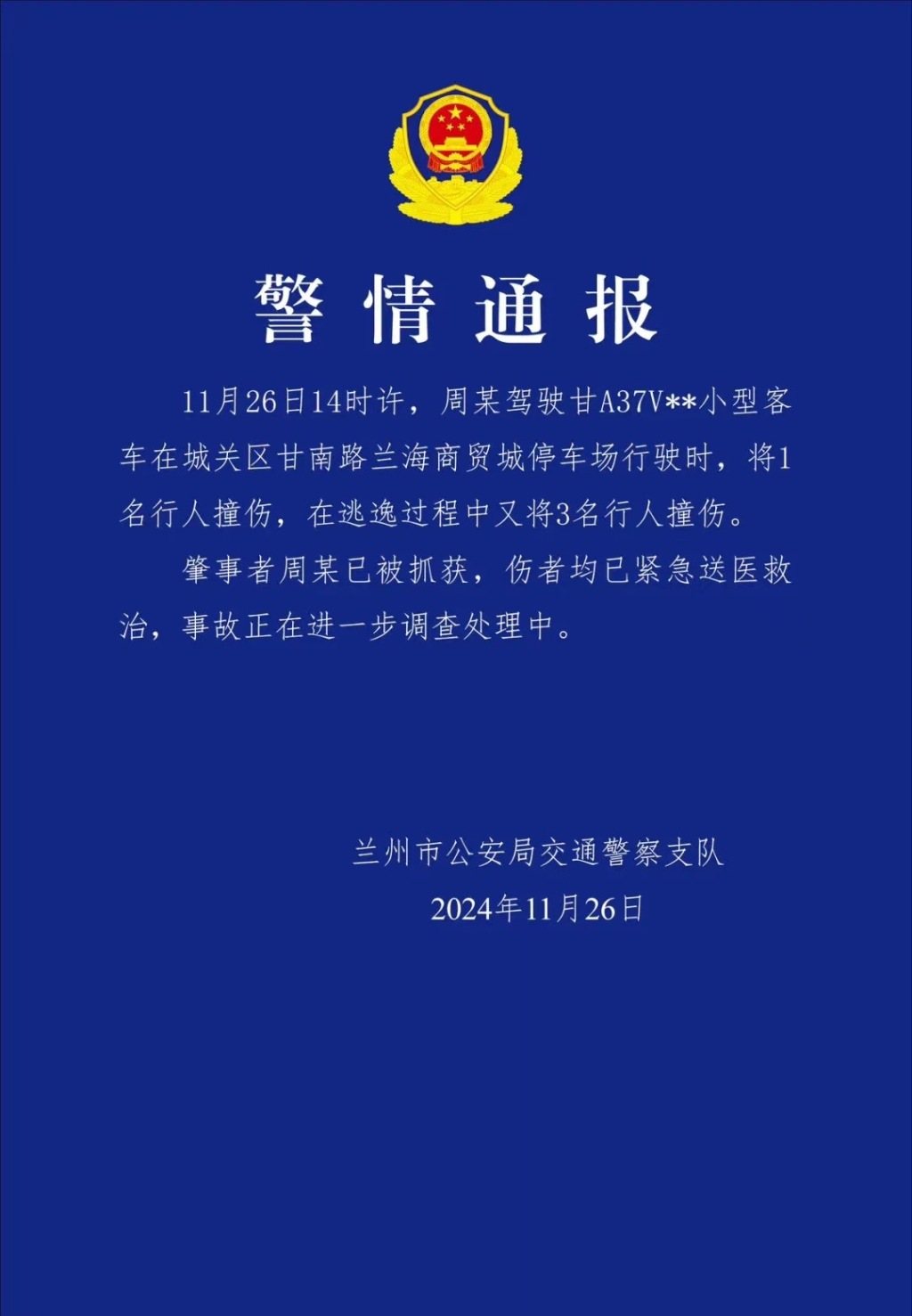 据兰州市公安局交通警察支队发布的警情通报,11月26日14时许,周某驾驶甘A37V**小型客车在城关区甘南路兰海商贸城停车场行驶时,将1名行人撞伤,在逃逸过程中又将3名行人撞伤。肇事者周某已被抓获,伤者均已紧急送医救治,事故正在进一步调查处理中。