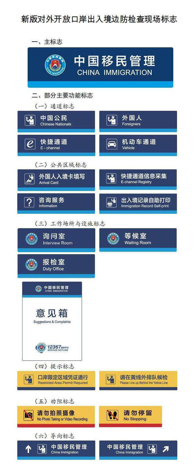新版对外开放口岸出入境边防检查现场标志分为主标志和功能标志两类。主标志是在对外开放口岸标示出入境边防检查机关的标志,由中国移民管理标志和“中国移民管理”中英文字共同组成。其中,中国移民管理标志已于2021年4月2日启用。功能标志是在对外开放口岸出入境边防检查现场标示相关通道设施和提示导向的标志,细分为6种70个,具体包括16个通道标志,6个公共区域标志,21个工作场所与设施标志,9个提示标志,9个劝阻标志,9个导向标志。