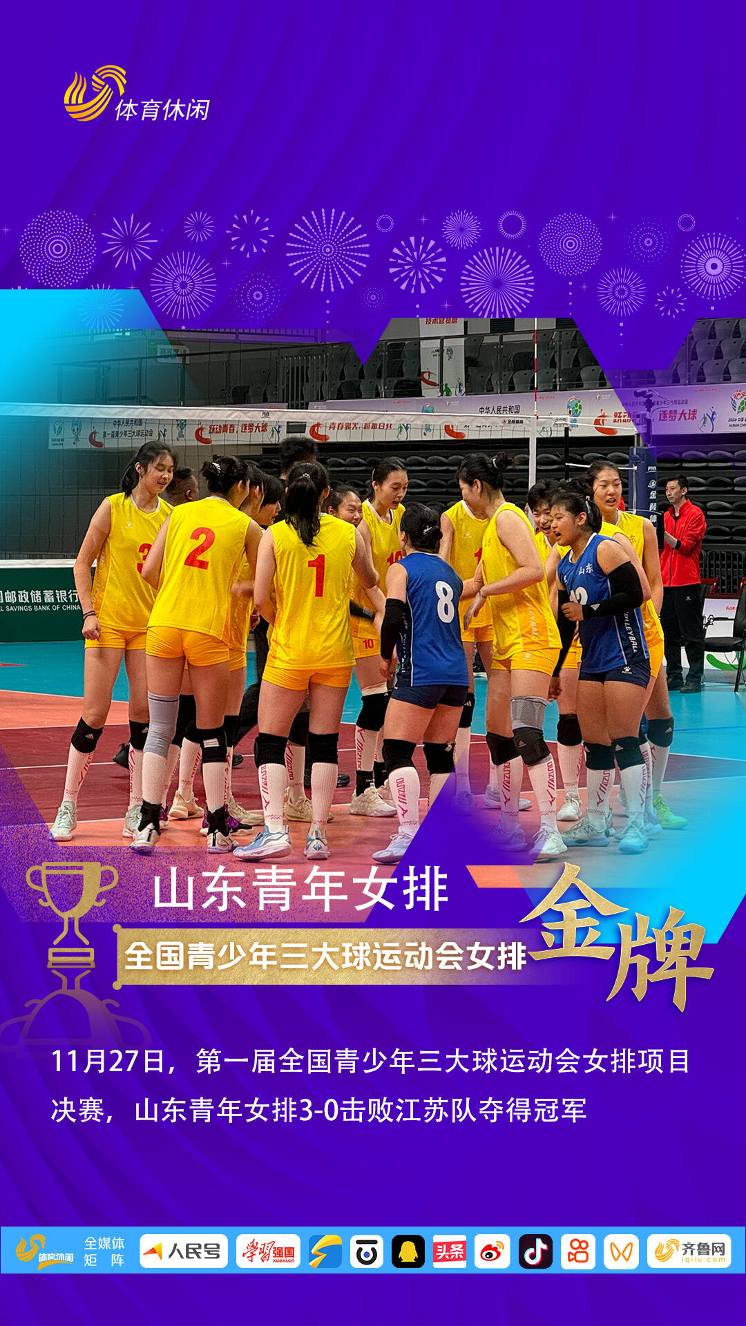 齐鲁网·闪电新闻11月27日讯 闪电体育消息,今天,第一届全国青少年三大球运动会继续进行,女排项目决赛打响,山东青年女排迎战江苏青年女排。最终,山东青年女排3-0击败对手,夺得冠军。