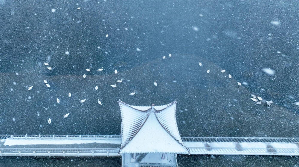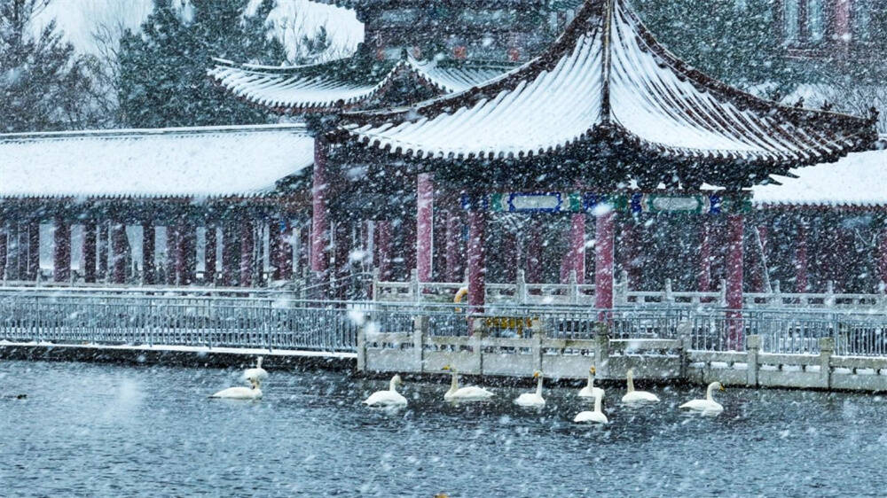 在西霞口社区隆霞湖里,大天鹅们不惧风雪,成群结队在水面畅游嬉戏,它们的身影与周围的亭台楼榭相映成画,美不胜收。