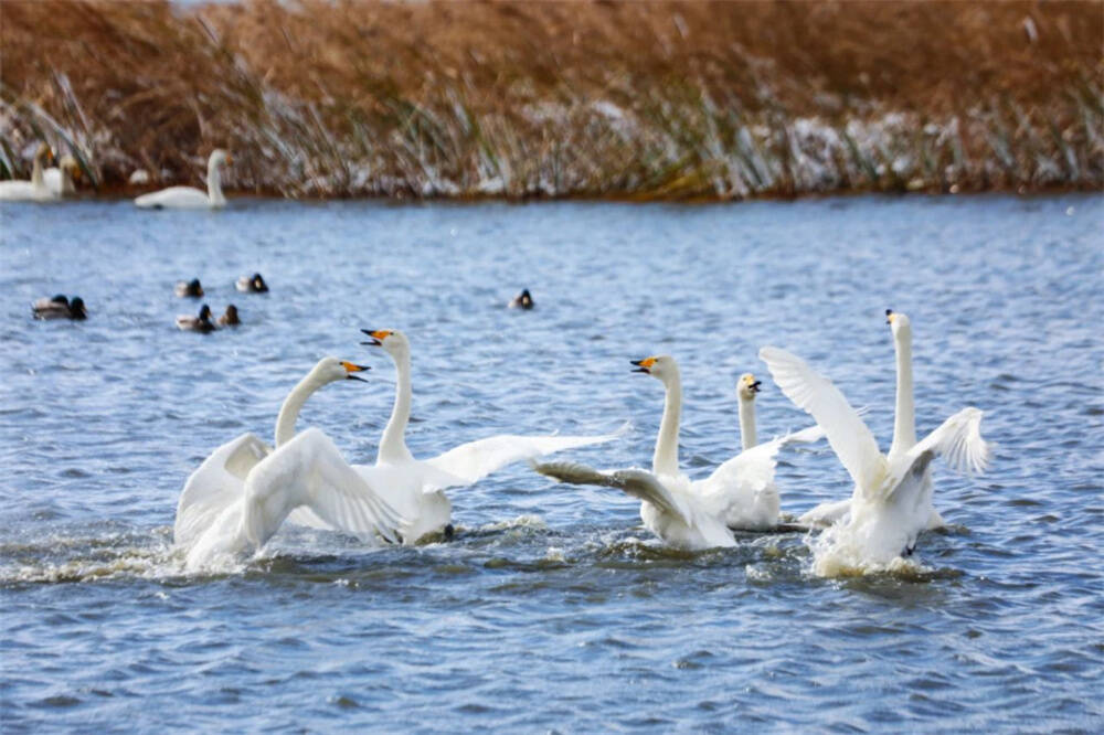 齐鲁网·闪电新闻11月28日讯 日前,受较强冷空气影响,荣成迎来今冬首场降雪。初雪轻吟至,飘飘洒洒,大地一片银装素裹,带来冬季特有的诗意与浪漫。在位于荣成好运角的天鹅湖,风雪中,洁白的天鹅仙子们成为了最美的风景。它们在湖中或嬉戏打闹、或引吭高歌、或翩翩起舞,不仅给寒冷的冬天带来了一抹温暖的色彩,更让人们感受到人与自然和谐相处的美好画面。