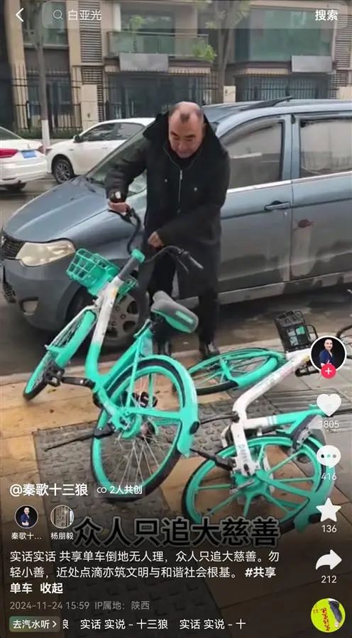 据了解,其社交账号“秦歌十三狼”有17万多粉丝,几天前的11月24日还发表了扶起共享单车的视频,并配文说:实话实说,共享单车倒地无人理,众人只追大慈善。勿轻小善,近处点滴亦筑文明与和谐社会根基。