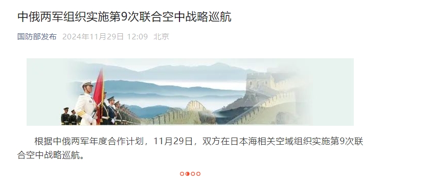 根据中俄两军年度合作计划,11月29日,双方在日本海相关空域组织实施第9次联合空中战略巡航。