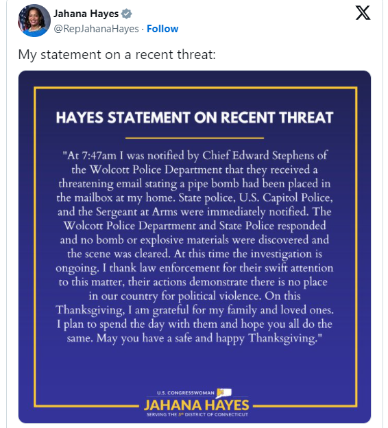 事件发生后,其中一名遭炸弹威胁的民主党人贾哈娜·海耶斯通过社交媒体发表声明,呼吁和平、文明地度过节日,并称“我们的国家不容许政治暴力”。
