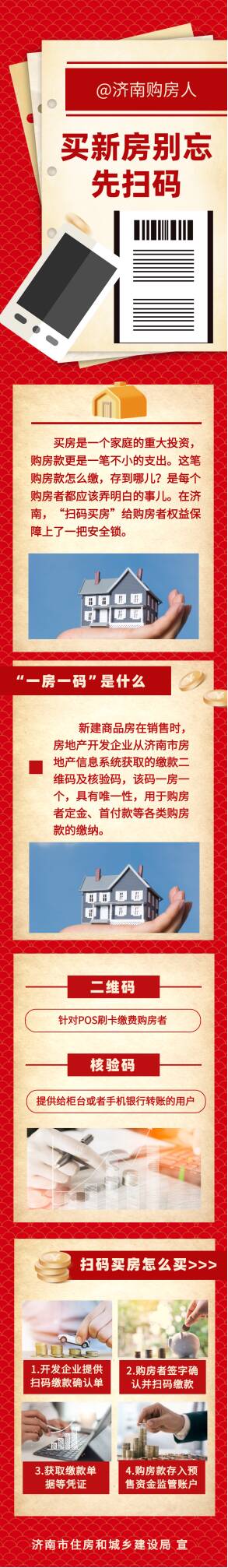 “一房一码”是指新建商品房在销售时,房地产开发企业从济南市房地产信息系统获取的缴款二维码及核验码,该码一房一个,具有唯一性,用于购房者定金、首付款等各类购房款的缴纳。