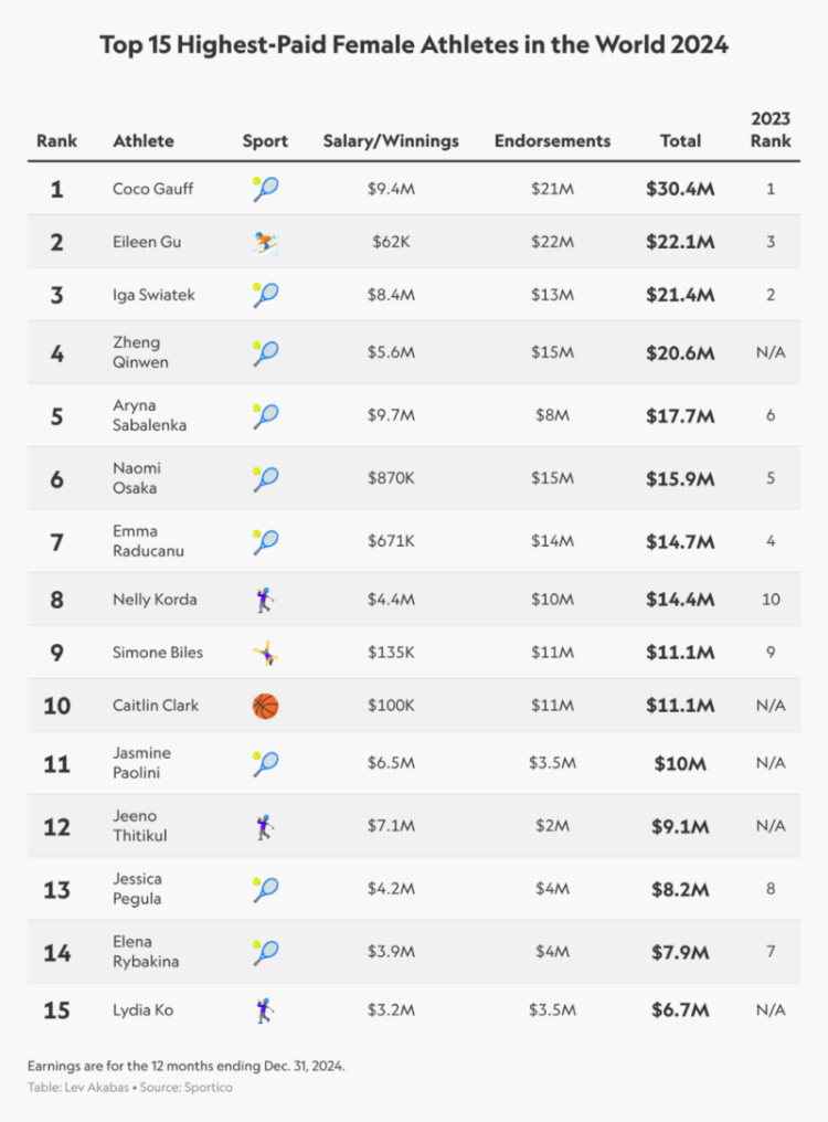 在女子体育的世界,网球一直是商业价值最高的运动项目没有之一,如今新出炉的这份2024年女运动员收入榜单再次印证了这一点。