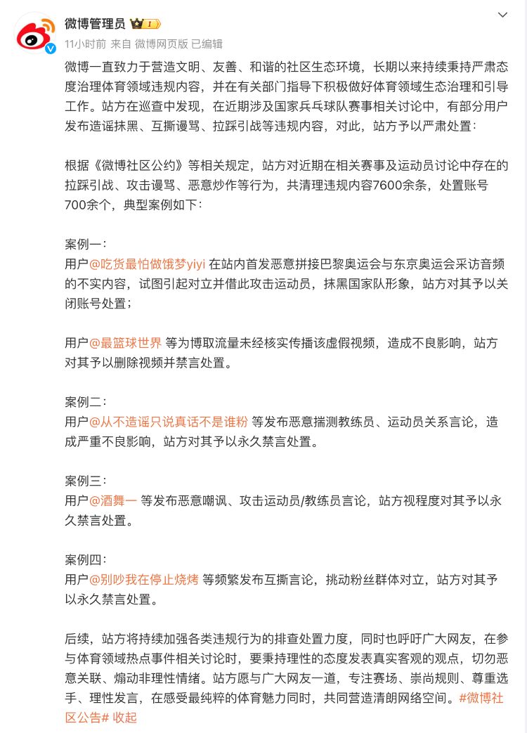 近日,在关于国乒的网络讨论中,个别用户违规发布不实信息,对相关运动员、教练员、裁判员等进行侮辱谩骂,或参与、煽动粉丝群体间互撕对立。