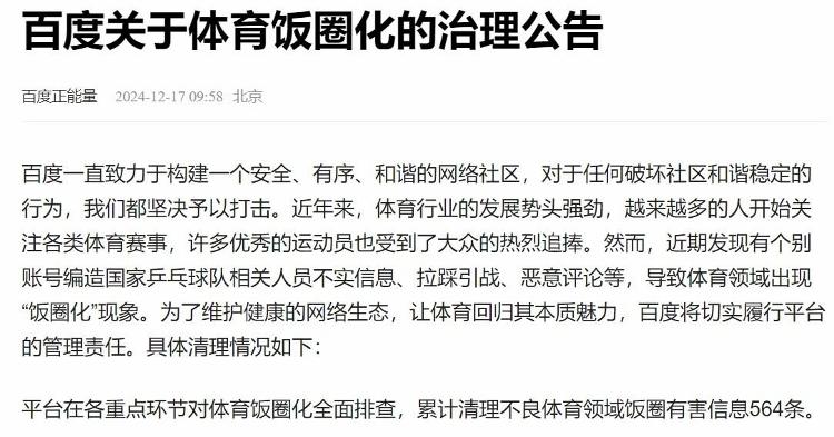 奥运会期间,相关法律部门已经开始着手整治网络“饭圈”行为,各平台和政府部门也对此现象予以高度重视。奥运会乒乓球女单决赛后,微博平台共清理相关违规内容12000余条,并对300余个违规账号予以不同程度处置。8月15日,公安机关网络安全部门公布了4起打击整治涉体育领域“饭圈”违法犯罪典型案例,其中3起涉及乒乓球。