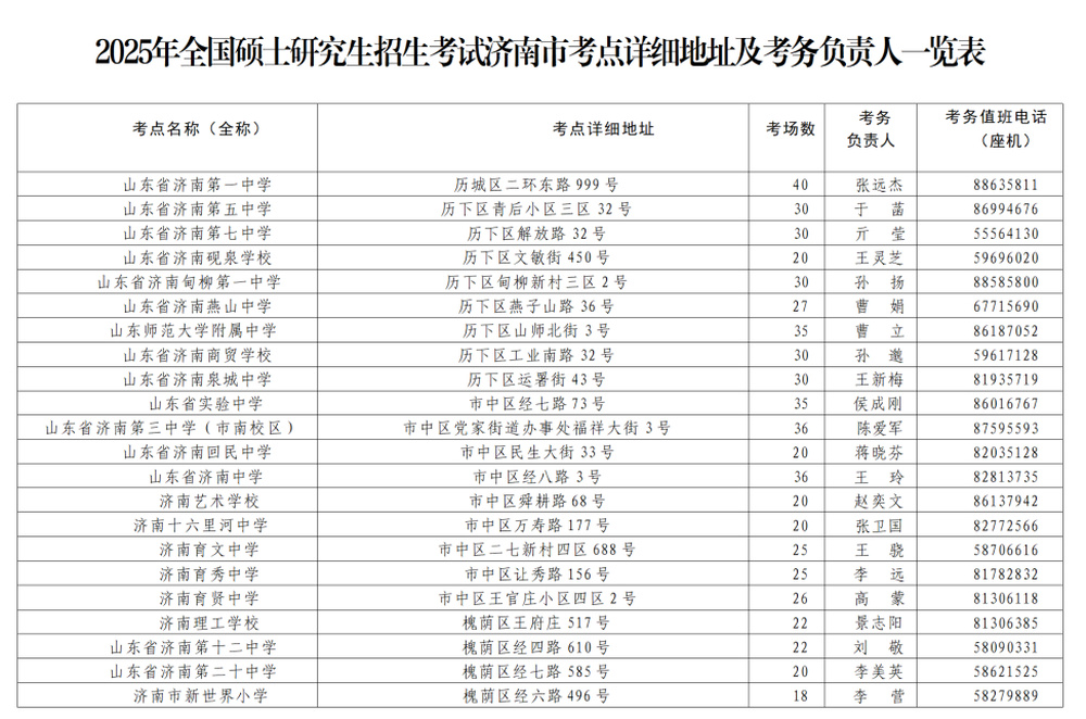 山东省2025年硕士研究生招生考试(初试)将于12月21日—22日进行,济南市共设历下、市中、槐荫、天桥、历城、高新、长清、章丘8个考区,共60个考点。为帮助广大考生顺利完成考试,现将考试安排及有关注意事项作以下提示,请考生及家长关注,提前做好考试准备。