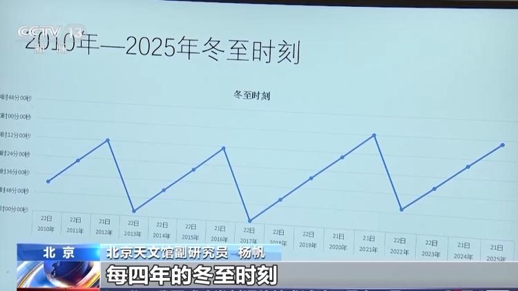 北京天文馆副研究院 杨帆:从长时段来看,今年的冬至并不特殊。现在网上很多说今年是120多年以来最早的一个冬至,但是其实再看更早的时间,比如1892年的冬至比今年的冬至要早。更明显,向后看,在21世纪内,从2024年开始,每4年的冬至时刻都比今年的冬至时刻要早。所以,我们在本世纪内还有十几次要比今年冬至早的时刻。