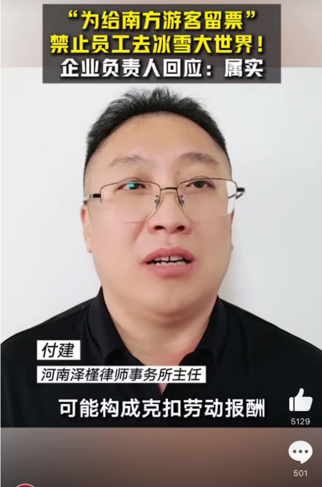 河南泽槿律师事务所主任付建表示,企业以员工去冰雪大世界为由取消其评优和年终福利或将违反《中华人民共和国劳动法》。