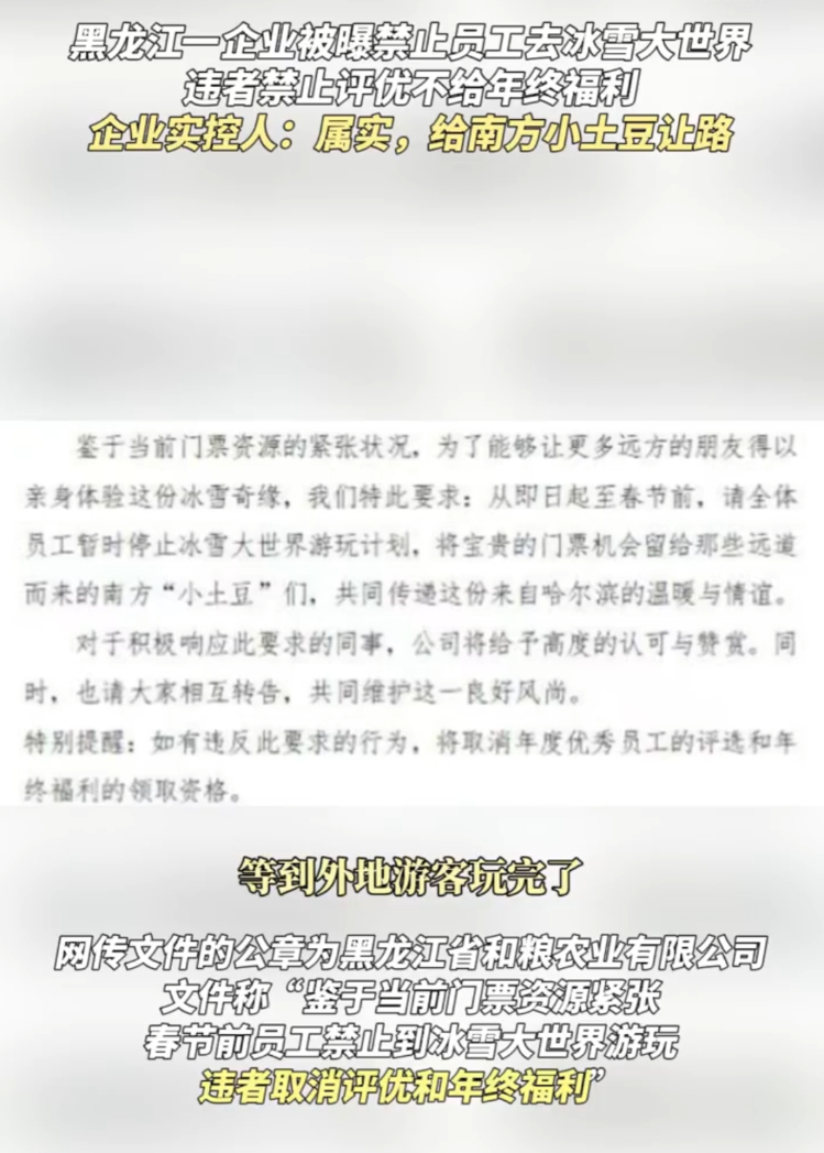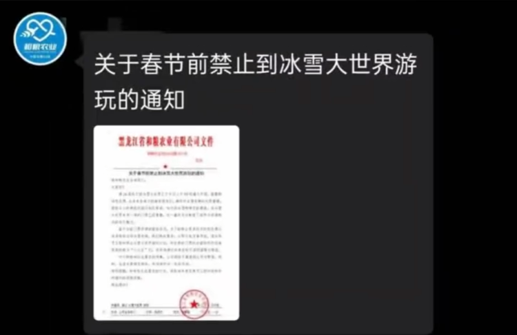 12月22日,一则关于春节前禁止员工到冰雪大世界游玩的通知引发关注。