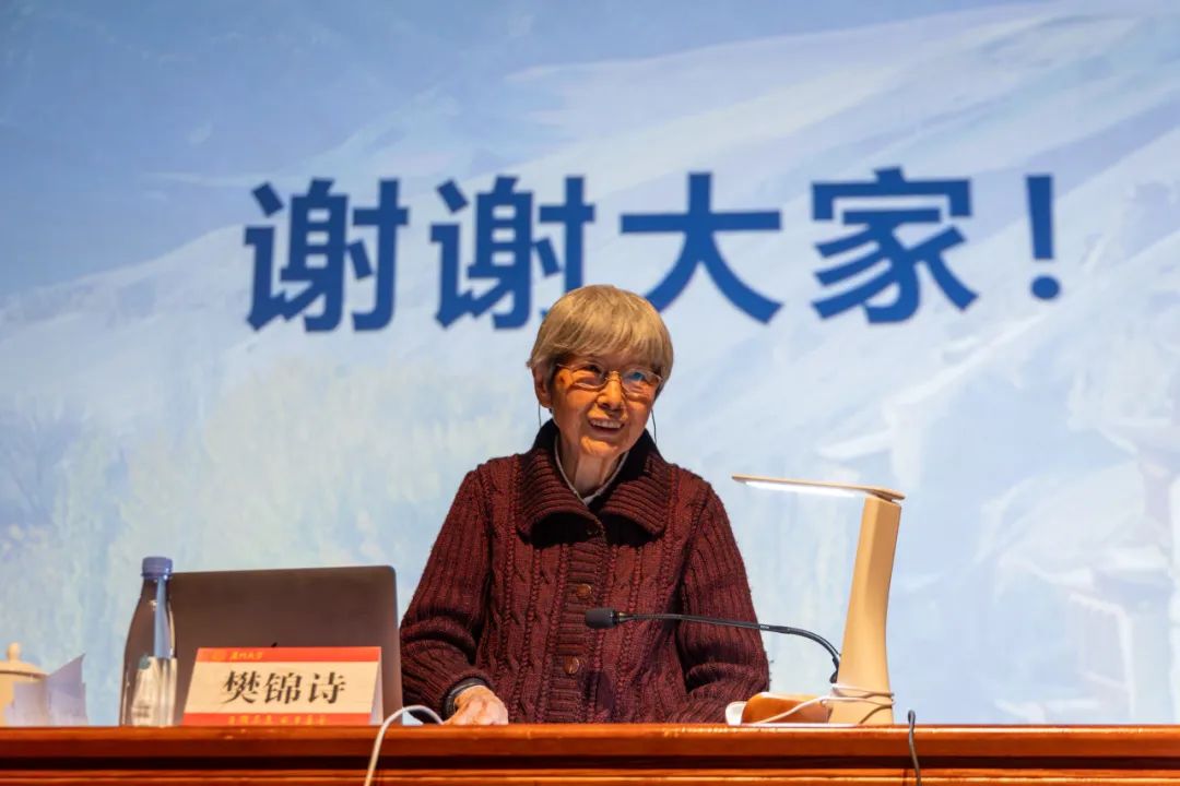 尽管年事已高、腿脚不便,樊锦诗也坚持在每一次掌声响起时起立、鞠躬、致谢。