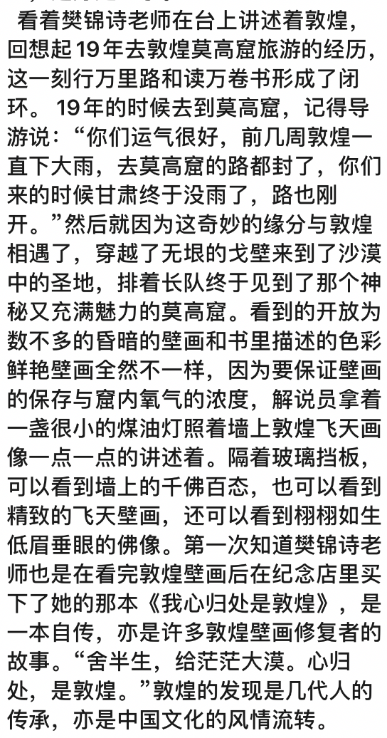 从敦煌与丝绸之路的历史联系,到每座建筑、每幅壁画的内涵,都展现出她对敦煌文化这一宝贵遗产深沉的爱。
