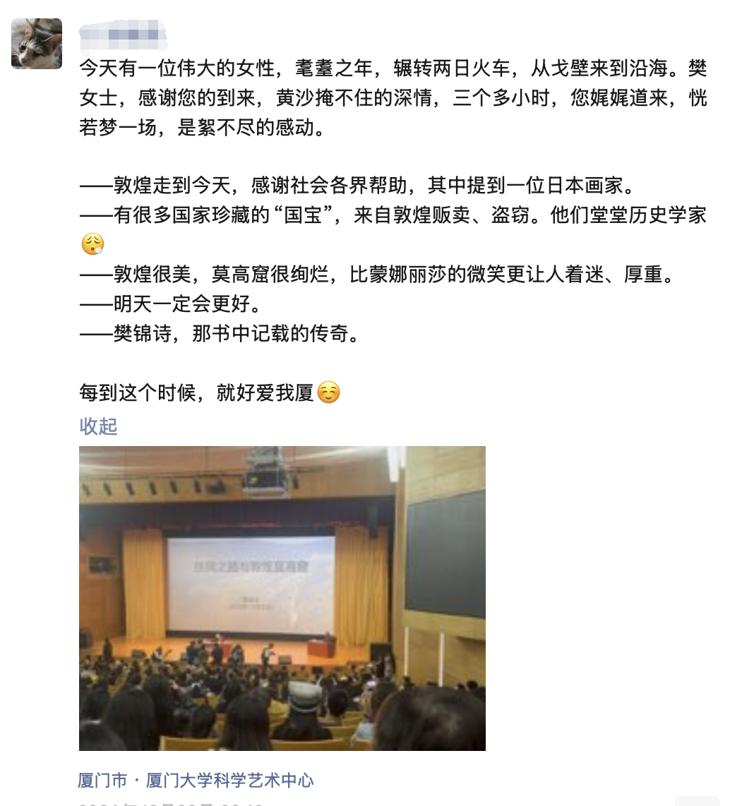 这次在厦大的演讲当中,樊锦诗也同样提到了这群“坚守大漠”的人。“1944年,敦煌开始得到保护,到现在整整80年。国家政策保护,社会各界的帮助,让莫高窟越来越好。几代人薪火相传,正体现了‘坚守大漠、甘于奉献、勇于担当、开拓进取’的莫高精神。”