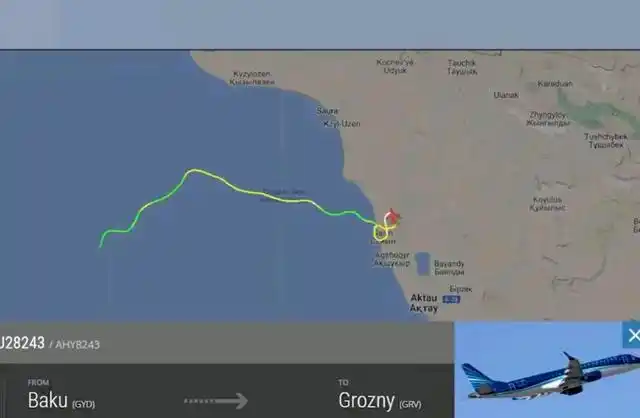 根据公开的飞行数据,涉事飞机在到达里海上空后,轨迹就变得有些奇怪,一开始向北,往俄罗斯方向,然后突然90度转弯,飞向哈萨克斯坦方向。飞机在到达阿克套机场前做8字形盘旋动作,随后进入俯冲状态,以机头朝下、向右转弯的姿态撞地。
