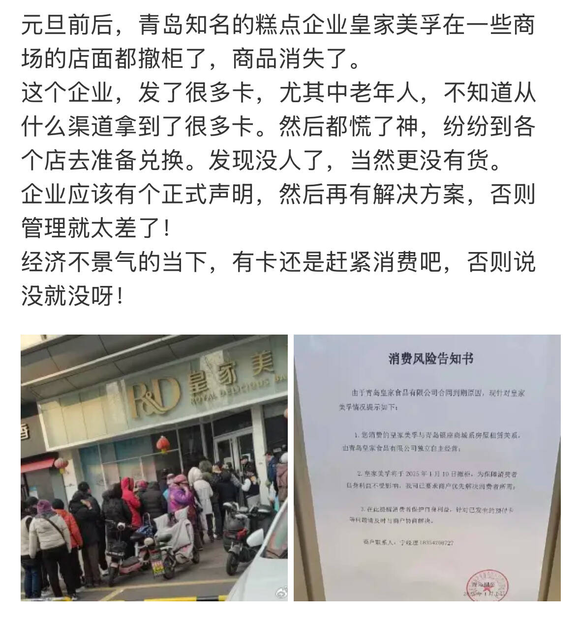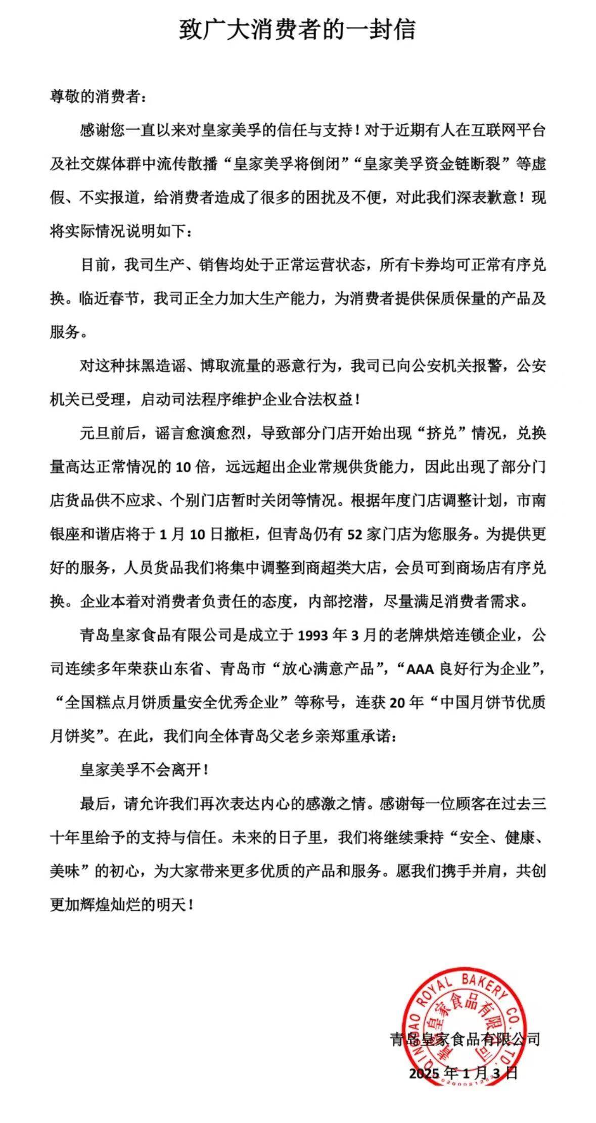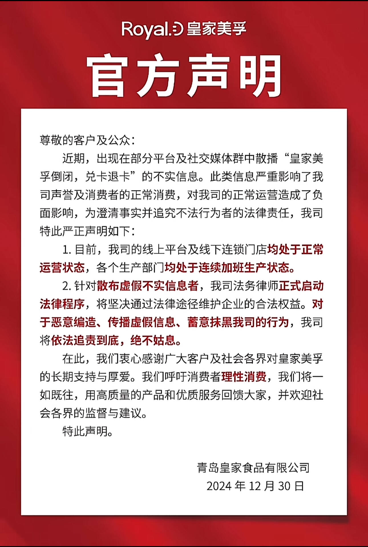 在皇家美孚办卡充值的会员看到网络上的消息后,都赶到门店采购消费,尽量将会员卡里的余额花完,但是随之而来的是更多的门店闭店或者缺货。12月30号,皇家美孚所属的青岛皇家食品有限公司发布官方声明,表示传言不实,目前线上平台及线下连锁门店均处于正常运营状态,各个生产部门均处于连续加班生产状态。