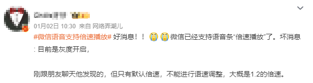 近日,有部分网友发现,微信的语音消息可以倍速播放了。