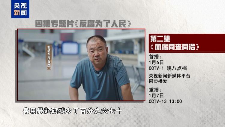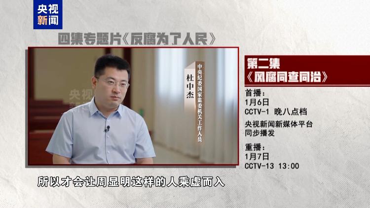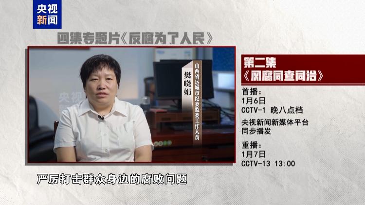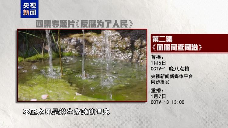 作风建设永远在路上,风腐交织是现阶段党风廉政建设和反腐败斗争要着力解决的突出问题。四集电视专题片《反腐为了人民》第二集《风腐同查同治》,讲述纪检监察机关坚持正风肃纪反腐相贯通,以“同查”严惩风腐交织问题,以“同治”铲除风腐共性根源,以“查”、“治”贯通阻断风腐演变,着力推动正风反腐一体深化。央视综合频道1月6日晚8点档播出,央视新闻新媒体平台同步播发。